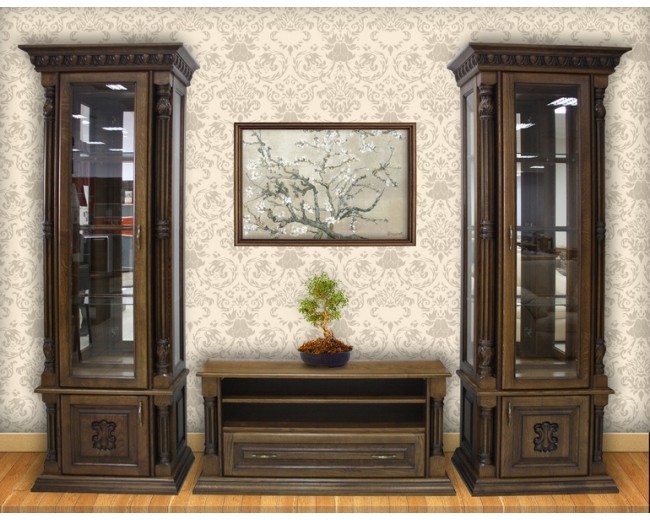 Вітальня виготовлена з елітних порід дерева включаючи елементи ручної різьби. .Комплект включає вітрини однодверні -2шт.,комод. За вашим бажанням комплектація може змінюватись.За детальною інформацією телефонойте менеджеру в робочий час, або залишіть заявку заповнивши форму "Запитати"